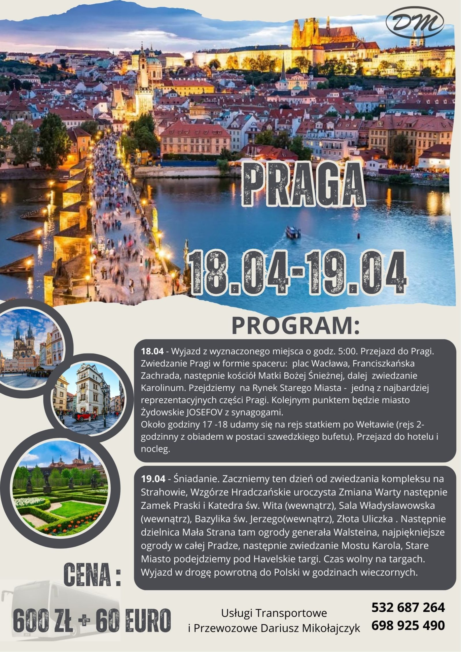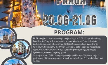 Wyjazd z wyznaczonego miejsca o godz. 5:00 (Woźniki, Wadowice), przejazd do Pragi.