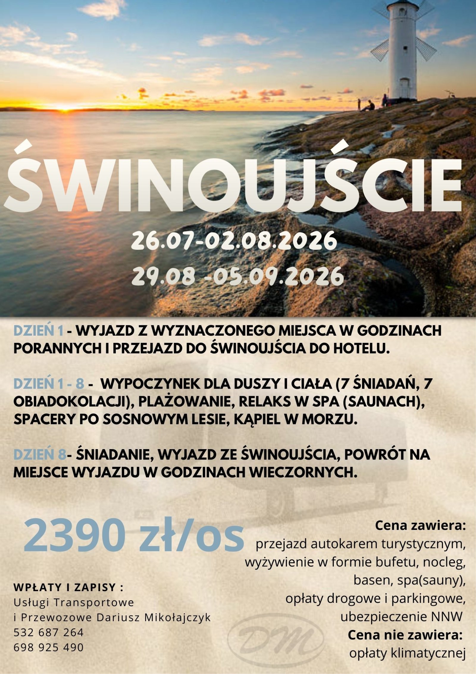 Dzień 8: śniadanie 8:00, wyjazd ze Świnoujścia o godz. 9:00, powrót na miejsce wyjazdu w godzinach wieczornych.