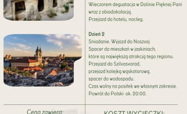 Wyjazd w godzinach wczesno rannych. Przyjazd do Egeru. Zakwaterowanie w Hotelu. Zwiedzanie miasta ze spacerem po zamku.