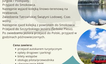 Wyjazd o godzinie 7:00. Przejazd przez Podhale i przejście graniczne Jurgów / Podspady. Przyjazd do Smokowca, następnie wyjazd kolejką linowo-terenową na Hrebienok