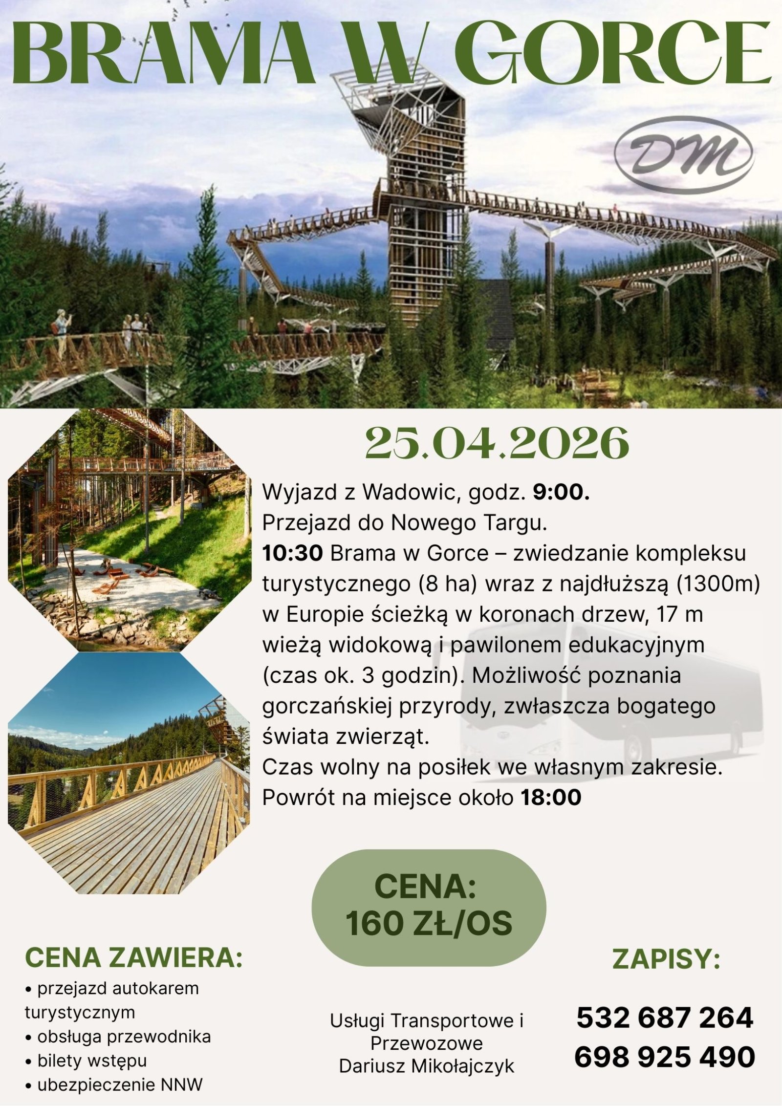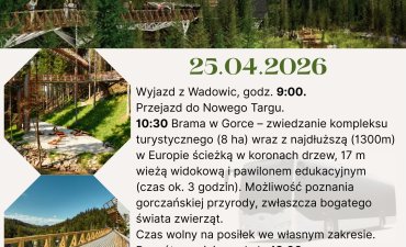 10:30 Brama w Gorce – zwiedzanie kompleksu turystycznego (8 ha) wraz z najdłuższą (1300 m) w Europie ścieżką w koronach drzew, 17 m wieżą widokową i pawilonem edukacyjnym (czas ok. 3 godzin). Możliwość poznania gorczańskiej przyrody, zwłaszcza bogatego świata zwierząt. Czas wolny na posiłek we własnym zakresie.