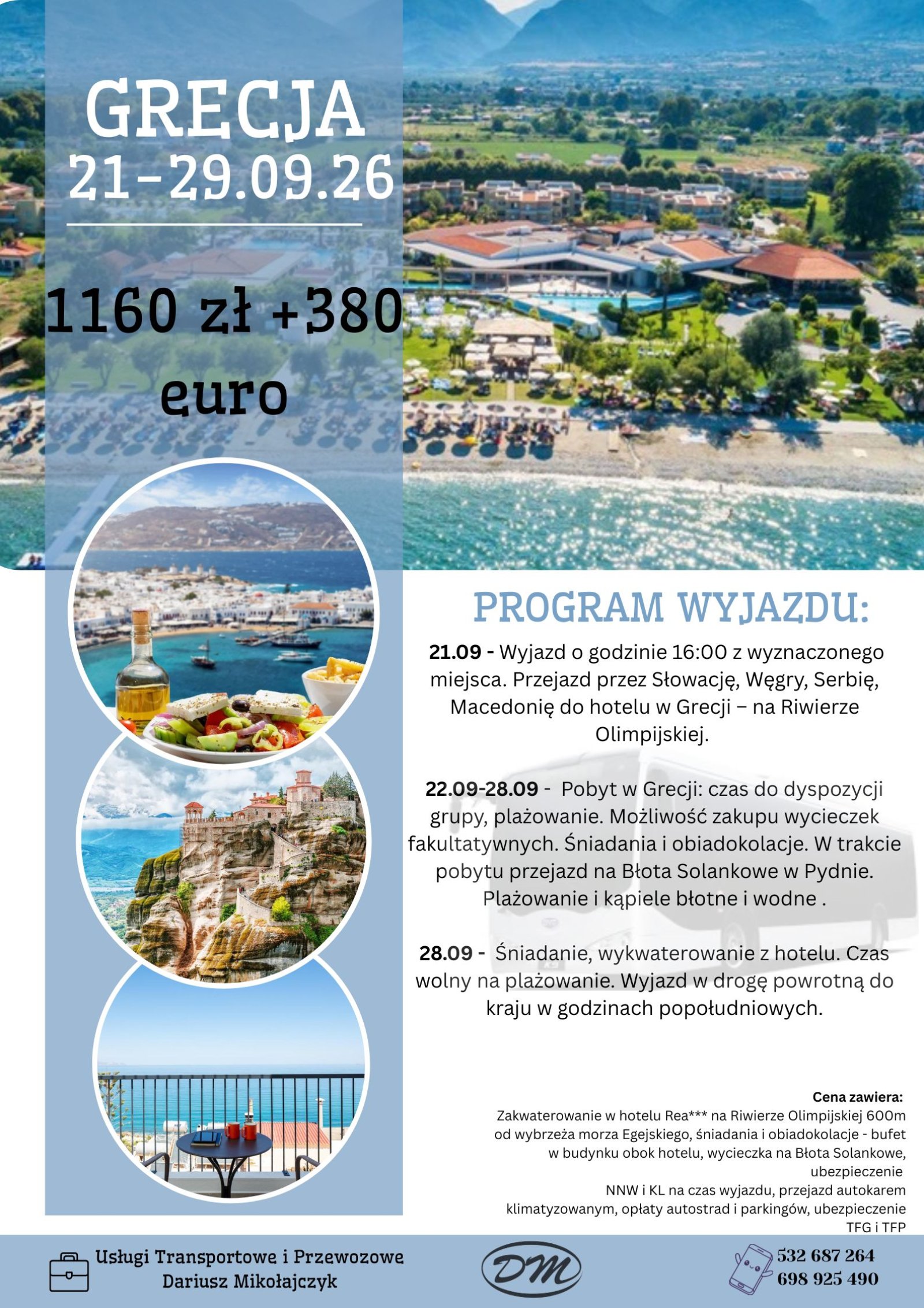 Zakwaterowanie w hotelu Rea*** na Riwierze Olimpijskiej 600m od wybrzeża morza Egejskiego, śniadania i obiadokolacje w budynku obok hotelu, wycieczka na Błota Solankowe, ubezpieczenie NNW i KL na czas wyjazdu, przejazd autokarem klimatyzowanym, opłaty autostrad i parkingów, ubezpieczenie TFG i TFP, opłatę klimatyczną.