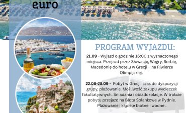 Całodzienna wycieczka na malowniczą wyspę Skiathos. Podczas rejsu zabawa na statku kapitana Kostasa, degustacja Metaxy, na wyspie zwiedzanie oraz plażowanie na plaży Koukounaries słynącej ze "złotego" piasku. Powrót do hotelu, obiadokolacja, nocleg – wyjazd o 5:00 ( śniadanie-suchy prowiant, powrót o 23:00) . Zwiedzanie z przewodnikiem jednej z największych atrakcji turystycznych Grecji kontynentalnej –zespołu klasztornego METEORA umieszczonego na skałach. Możliwość zwiedzania historycznego miasta Saloniki.