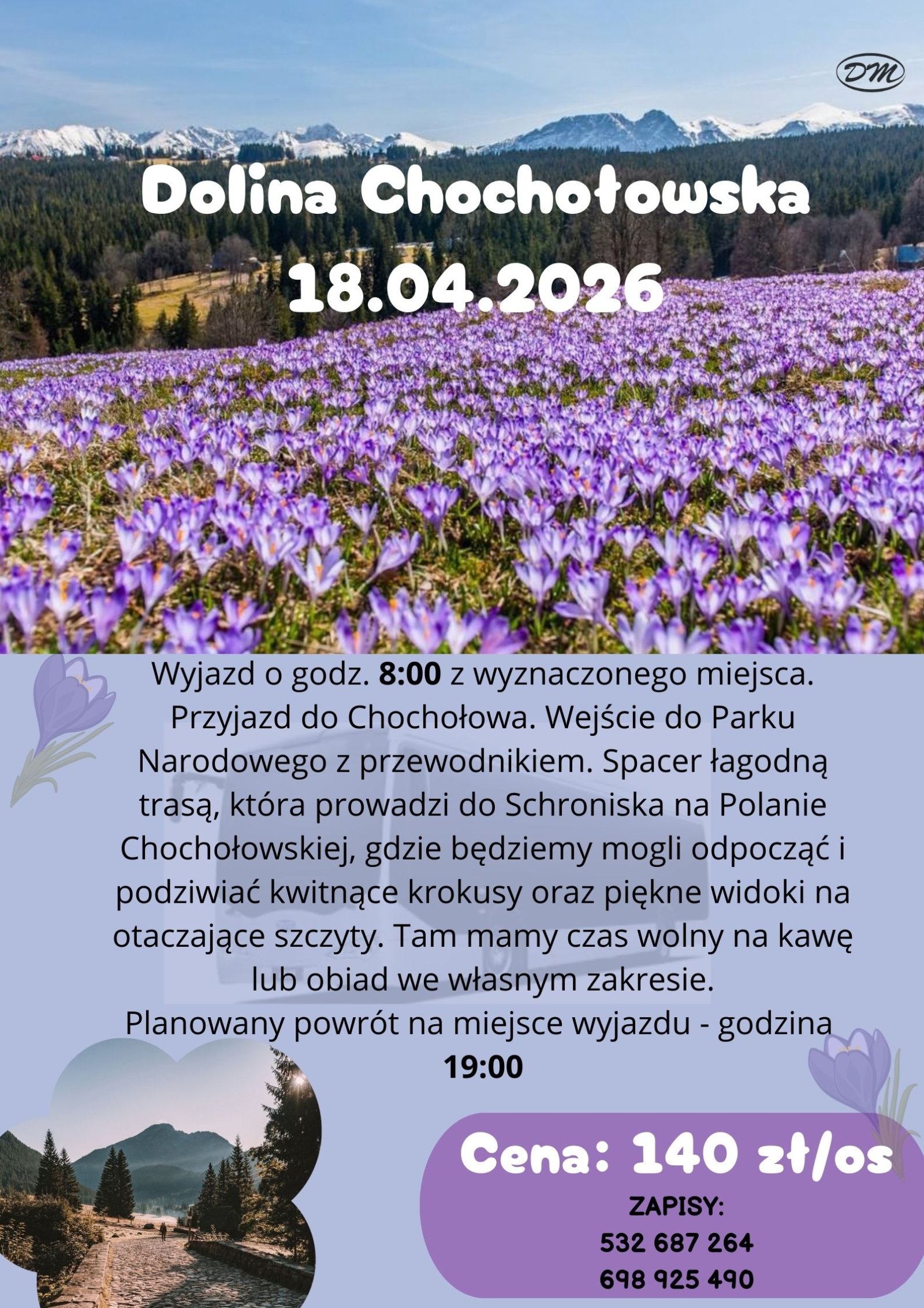 gdzie będziemy mogli odpocząć i podziwiać kwitnące krokusy oraz piękne widoki na otaczające szczyty.