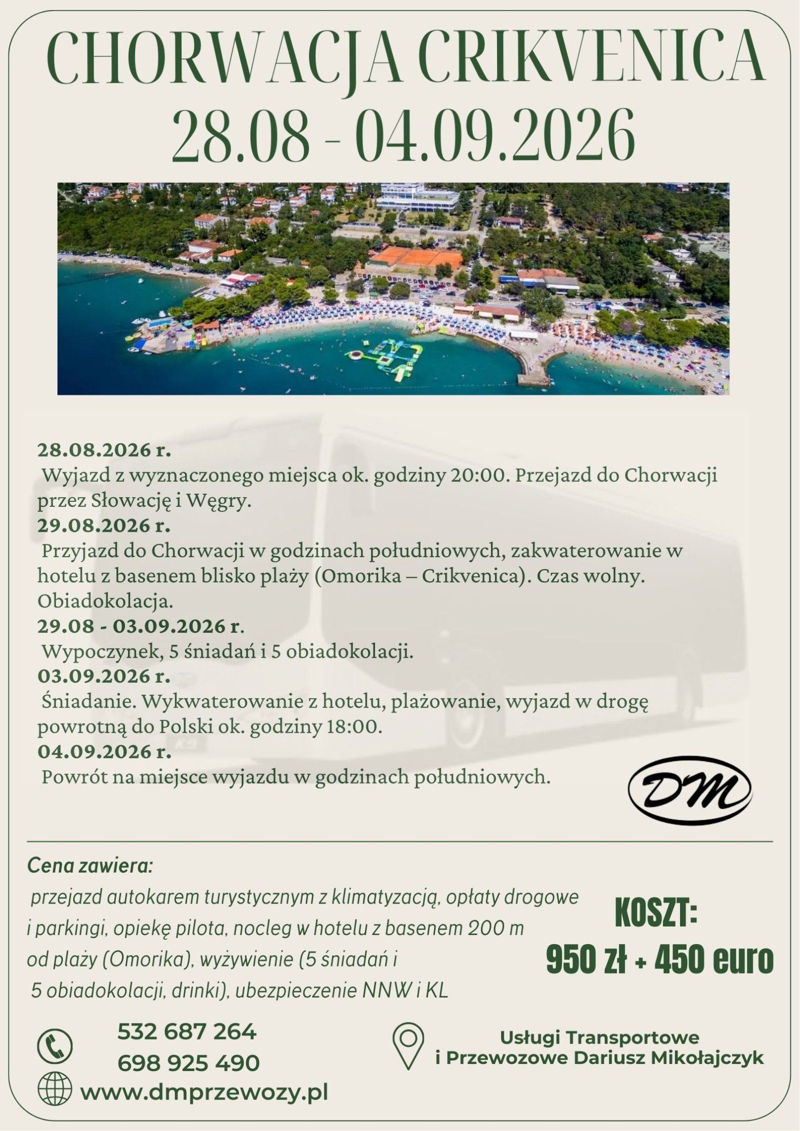 przejazd autokarem turystycznym z klimatyzacją, opłaty drogowe i parkingi, opiekę pilota, nocleg w hotelu z basenem 200 m od plaży (Omorika), wyżywienie (5 śniadań i 5 obiadokolacji, drinki), ubezpieczenie NNW i KL
