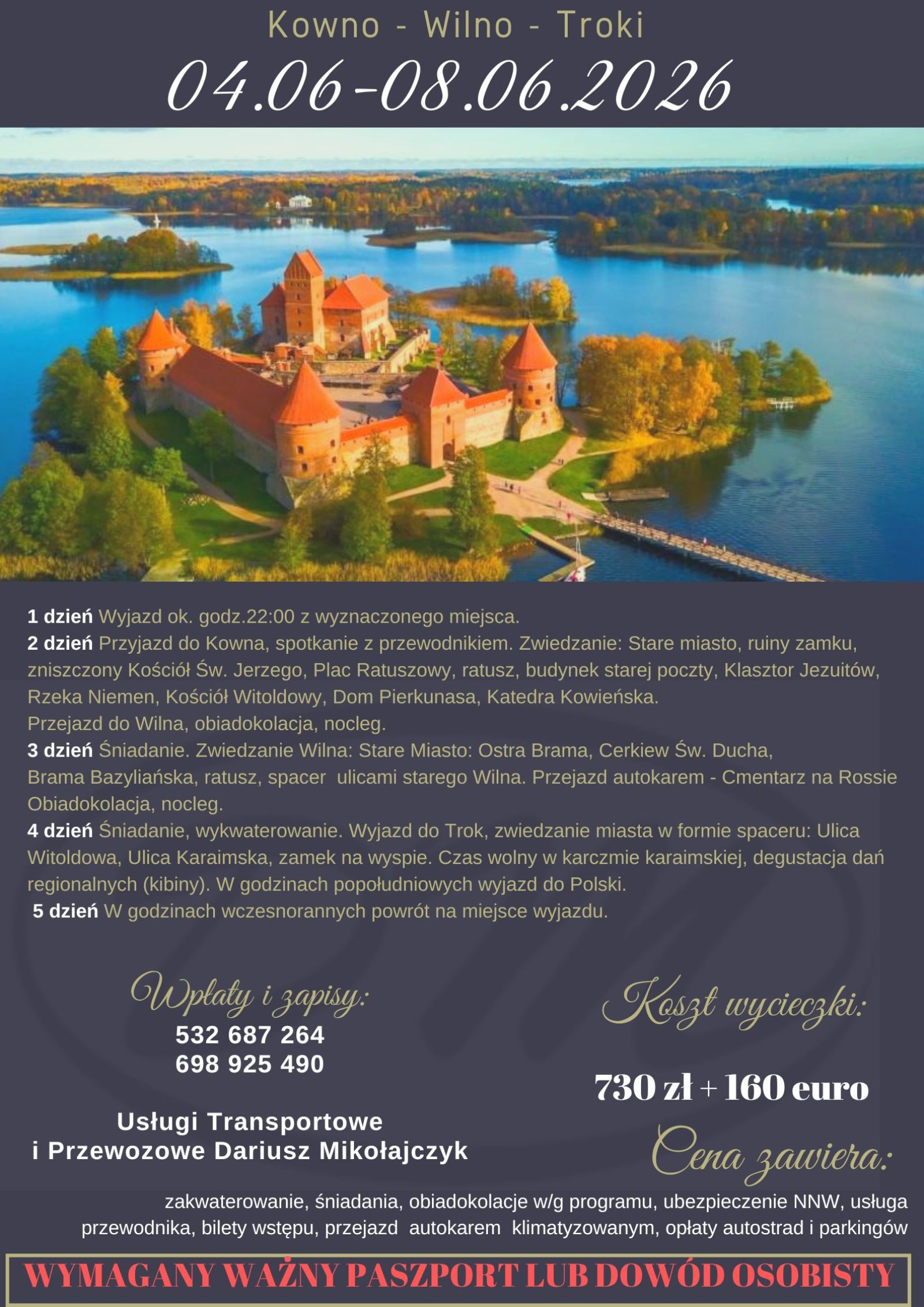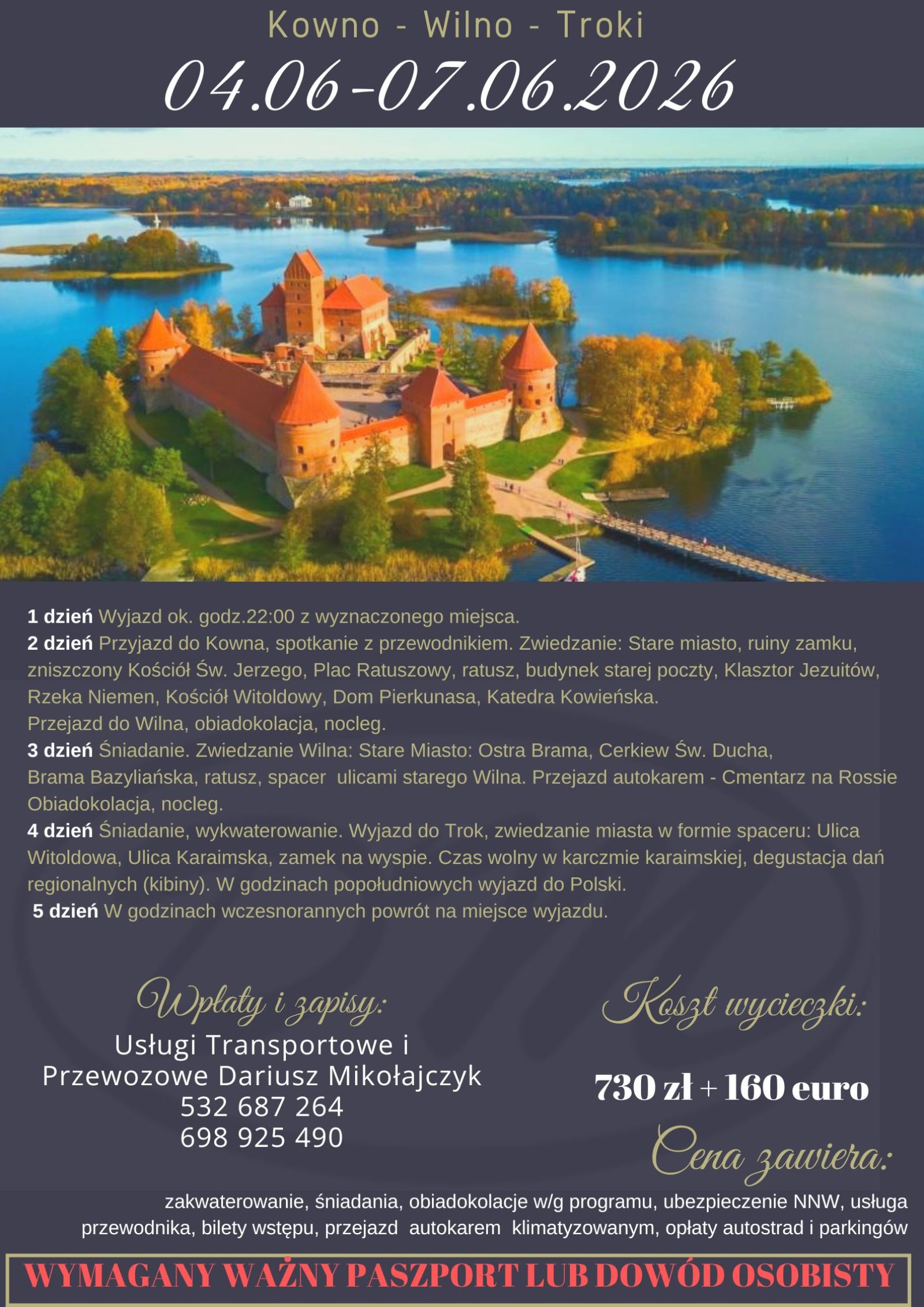 Cena zawiera: przejazd autokarem, 2 noclegi, wyżywienie, obsługę pilota, opłaty drogowe, parkingi, ubezpieczenie NNW i KL.
