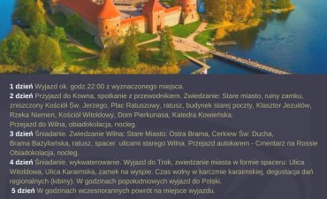 Śniadanie. Wyjazd do Trok. Zwiedzanie miasta w formie spaceru bez wnętrz. Ulicami : Witoldowa, ulica Karaimska, kinesa( bożnica karaimska), zobaczymy zamek na wyspie. Czas wolny w karczmie karaimskiej, degustacja dań regionalnych (kibiny) wliczone w cenę. Wyjazd do Polski