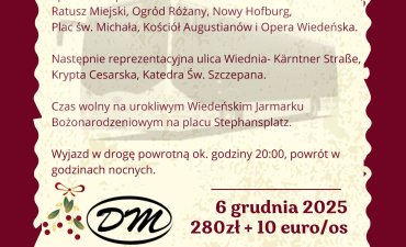 Wyjazd o godzinie 4:00 z wyznaczonego miejsca (Woźniki, Wadowice, Kalwaria Zebrzydowska) i przejazd do Wiednia. Spotkanie z przewodnikiem: zwiedzanie miasta: Parlament, Ratusz Miejski, Ogród Różany, Nowy Hofburg, Plac św. Michała, Kościół Augustianów i Opera Wiedeńska. Następnie reprezentacyjna ulica Wiednia- Kärntner Straße, Krypta Cesarska, Katedra Św. Szczepana.