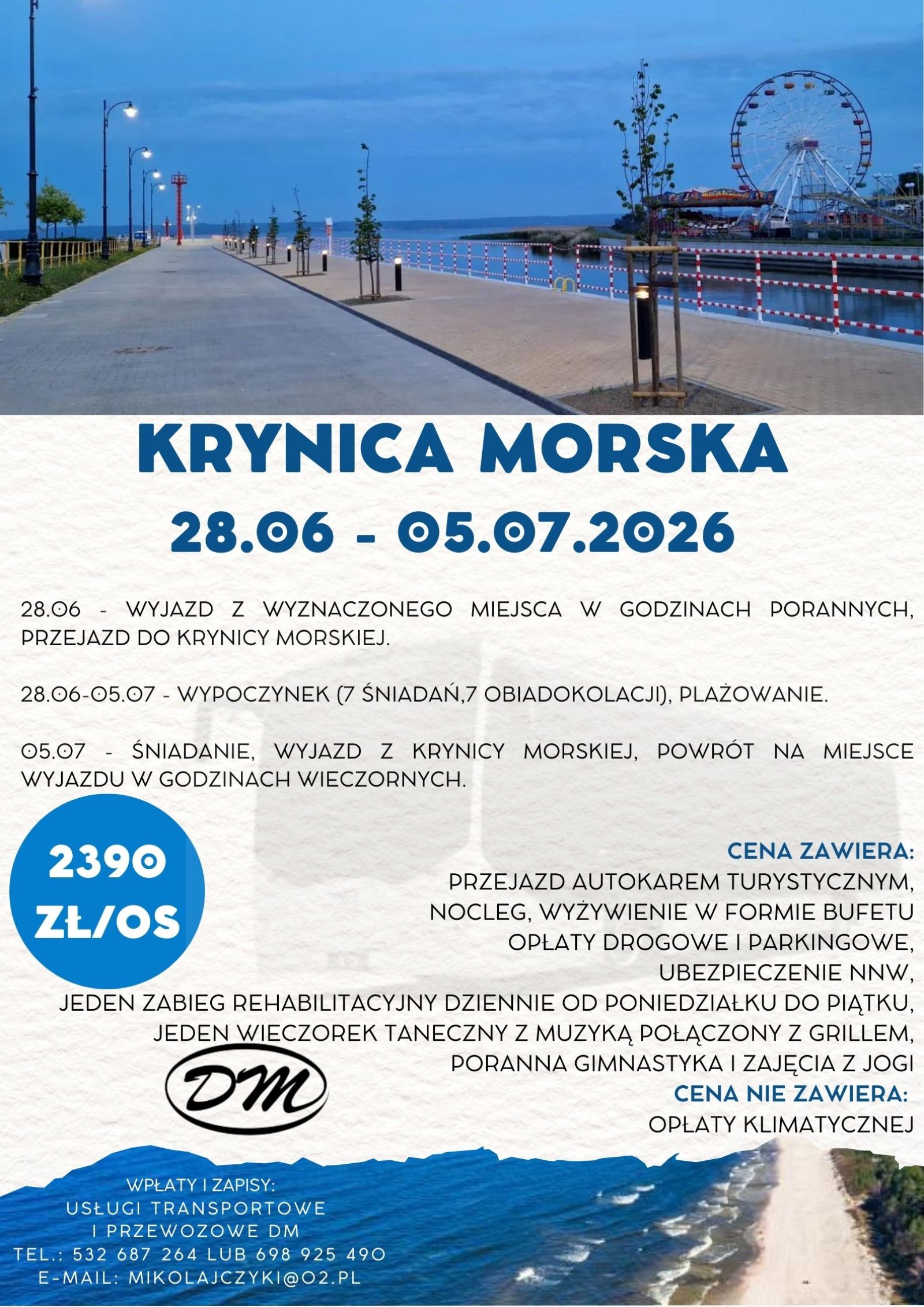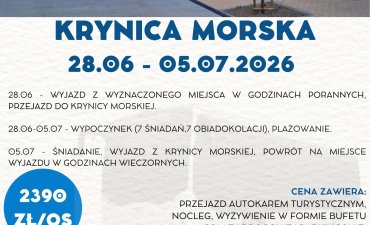 05.07- śniadanie, wyjazd z Krynicy Morskiej, powrót na miejsce wyjazdu w godzinach wieczornych.
