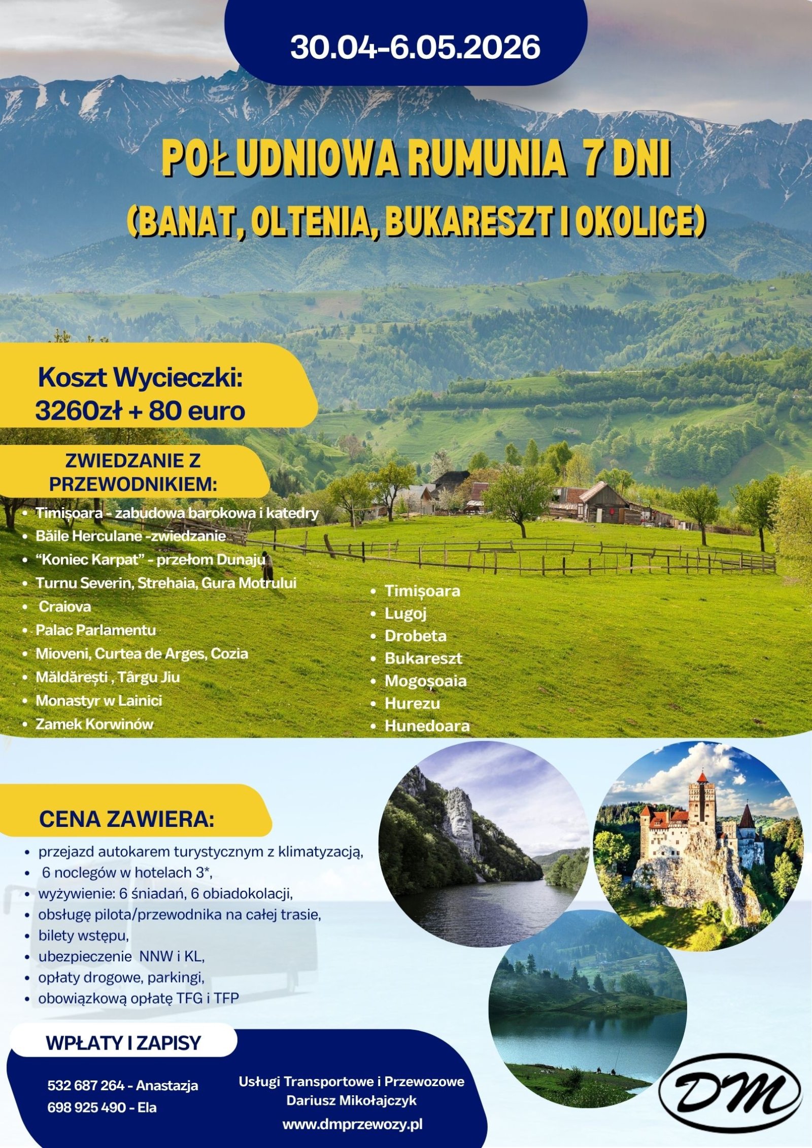 Wyjazd z wyznaczonego miejsca około godziny 4:00 (Woźniki, Wadowice, Kalwaria Zebrzydowska). Przejazd do Rumunii - przez Słowację, Węgry, przyjazd do Timişoary, Timişoara (zabudowa barokowa i secesyjna, katedry:rumuńska, węgierska i serbska, pamiątki rewolucji 1989 r), zakwaterowanie, obiadokolacja, nocleg.