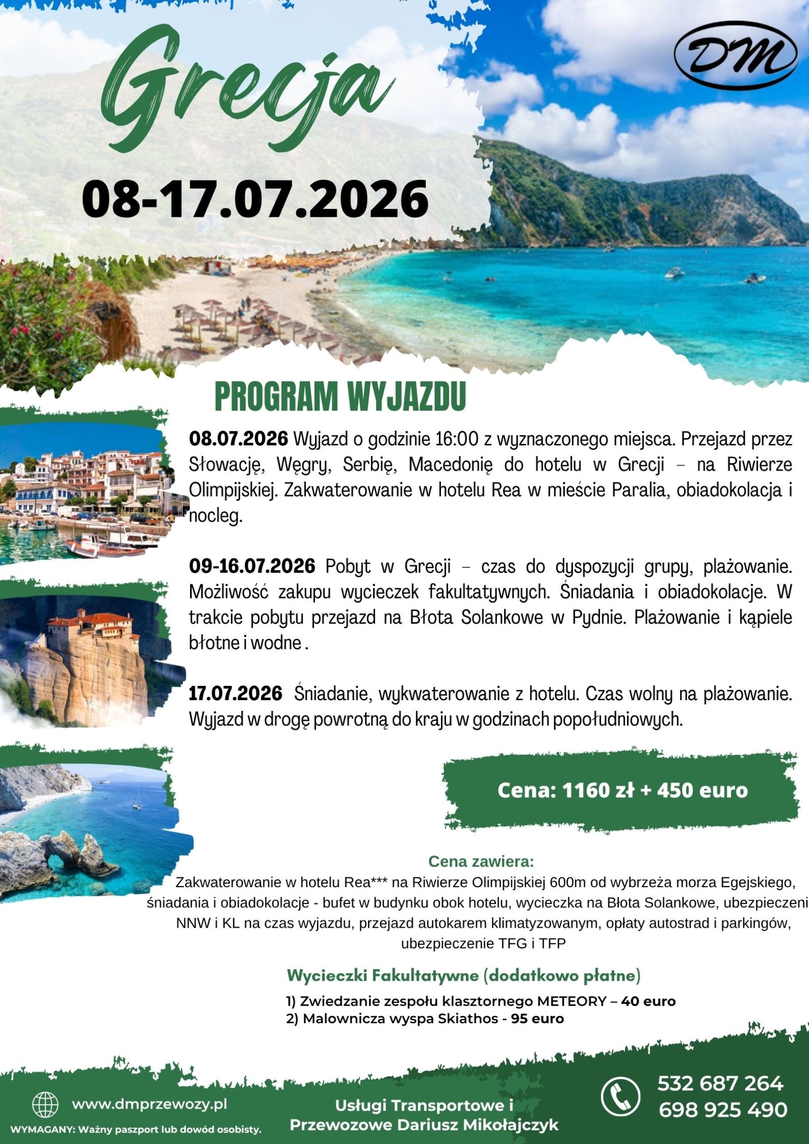 Zakwaterowanie w hotelu Rea*** na Riwierze Olimpijskiej 600m od wybrzeża morza Egejskiego, śniadania i obiadokolacje w budynku obok hotelu, wycieczka na Błota Solankowe, ubezpieczenie NNW i KL na czas wyjazdu, przejazd autokarem klimatyzowanym, opłaty autostrad i parkingów, ubezpieczenie TFG i TFP, opłatę klimatyczną.