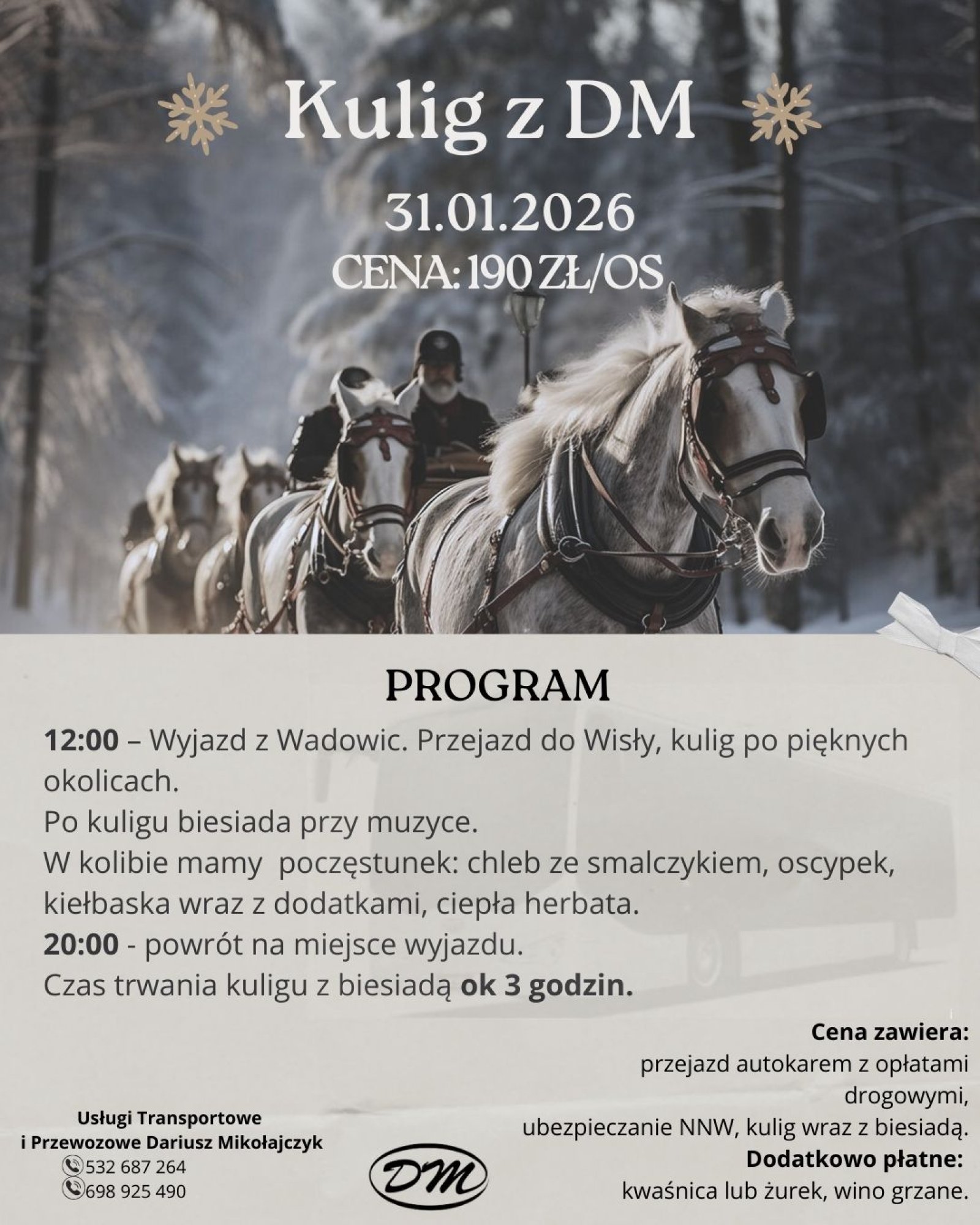 przejazd autokarem z opłatami drogowymi, ubezpieczanie NNW, kulig wraz z biesiadą.