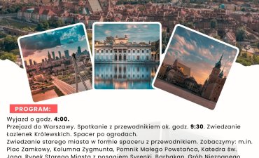Przejazd do Warszawy. Spotkanie z przewodnikiem ok. godz. 9:30. Zwiedzanie Łazienek Królewskich. Spacer po ogrodach.